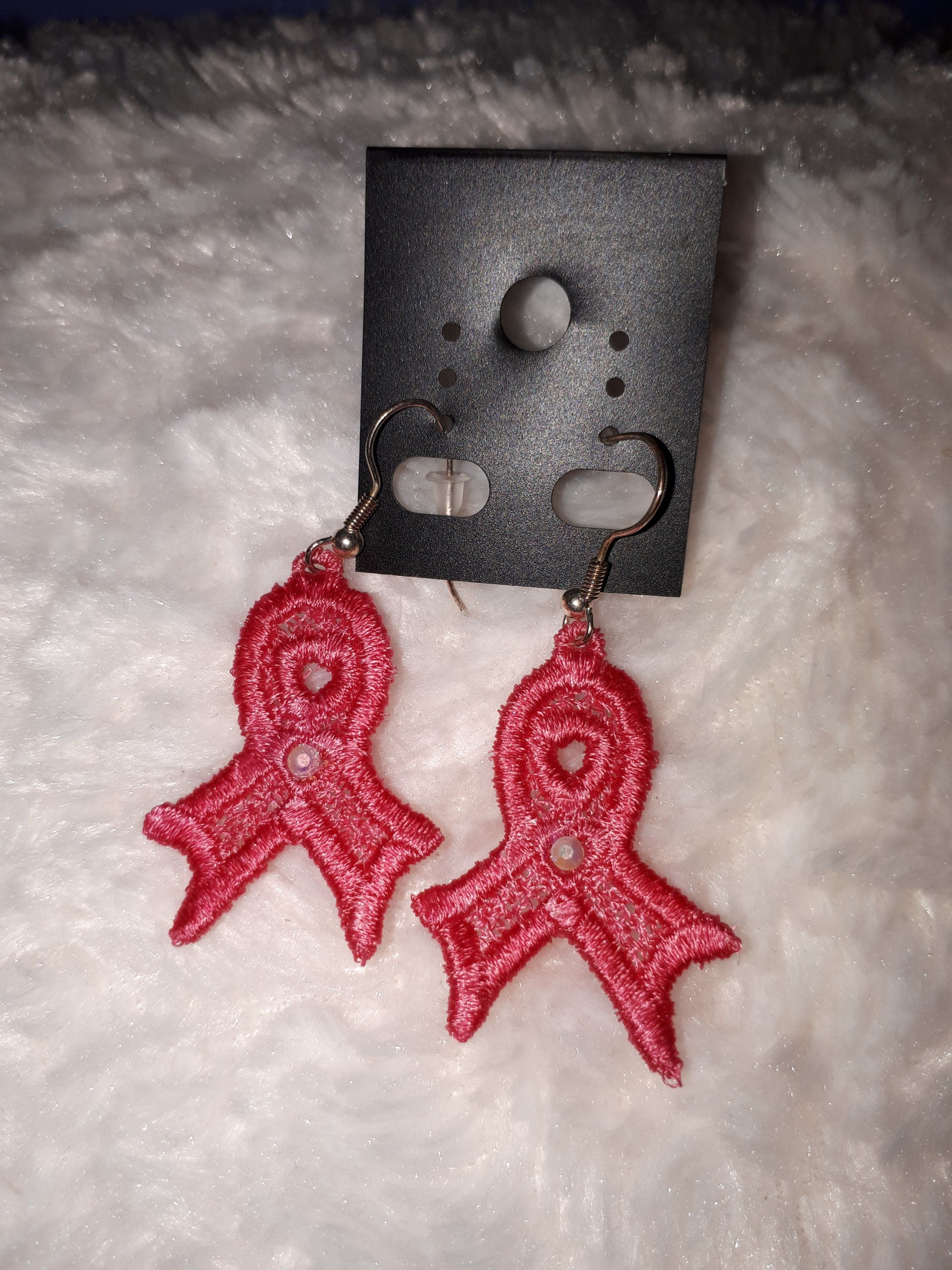 Deze Pink Ribbon oorbellen zijn geborduud en afgewerkt met Hotfix strass steentjes.