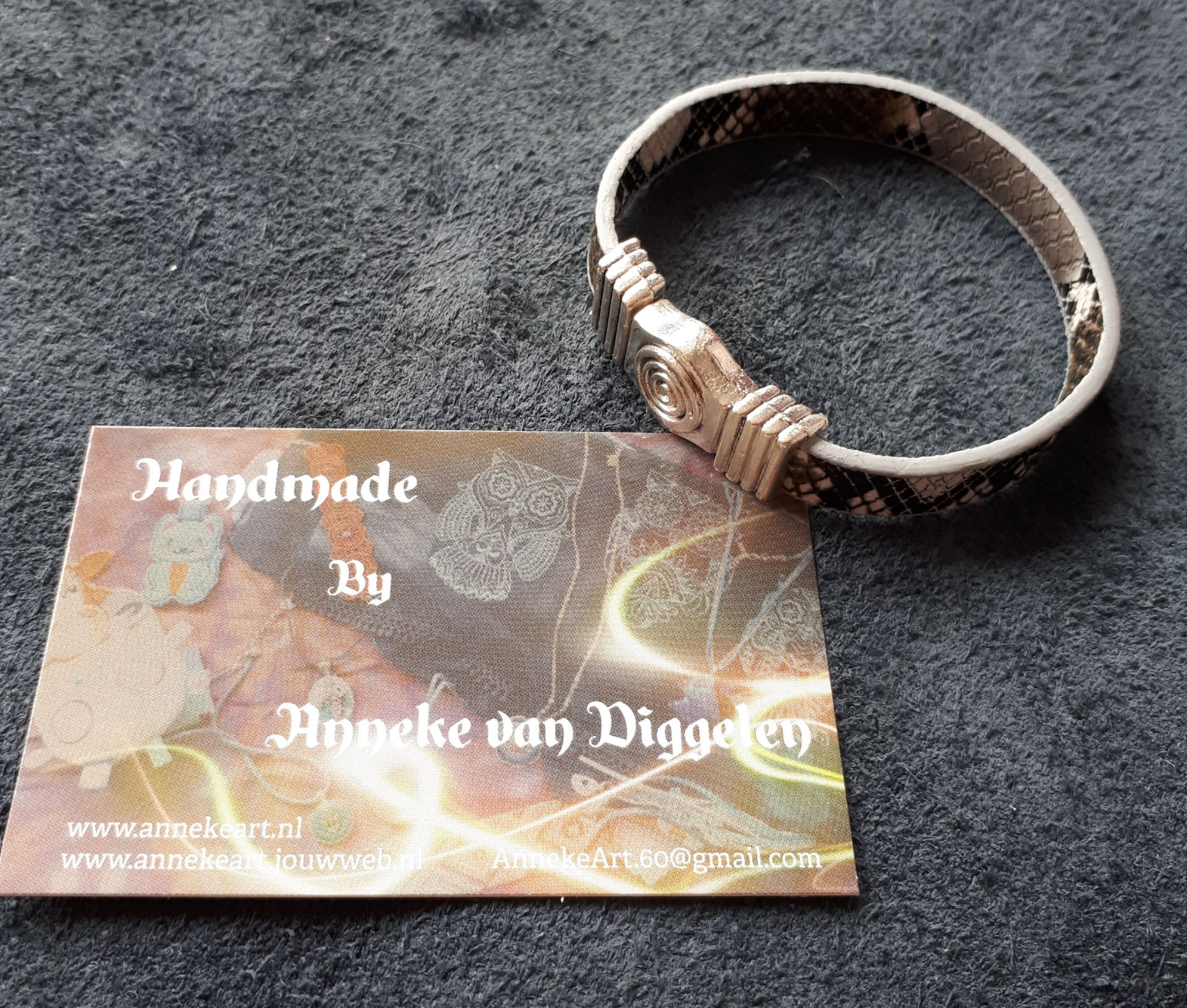 Dez armband heb ik gemaakt van slangen print skai band en heeft een magneet sluiting.