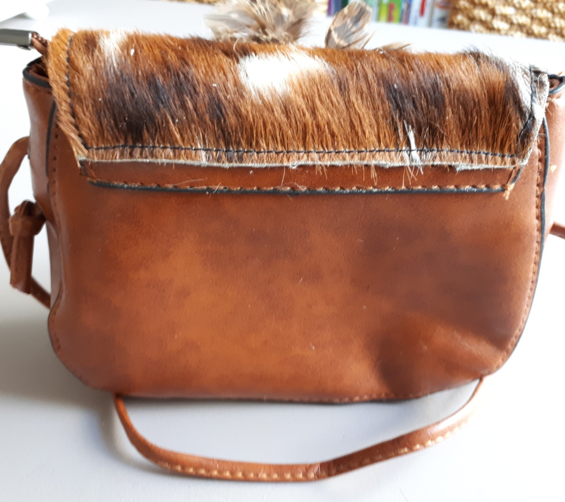 Op dit kleine tasje heb ik op de bovenkant koeienvacht gestikt en opgesierd met verschillende materialen.