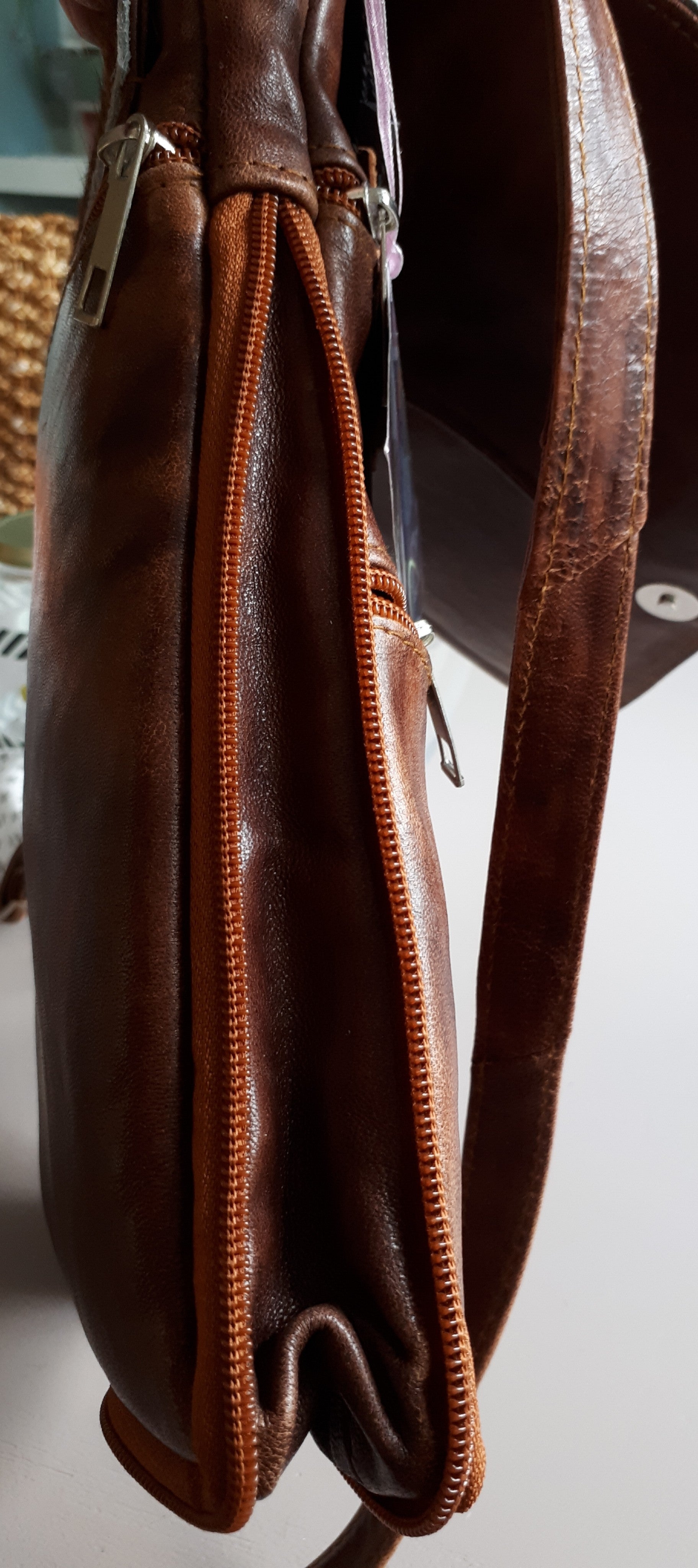 Deze ruime tas geheel van leer heb ik op de bovenkant koeienvacht gestikt.