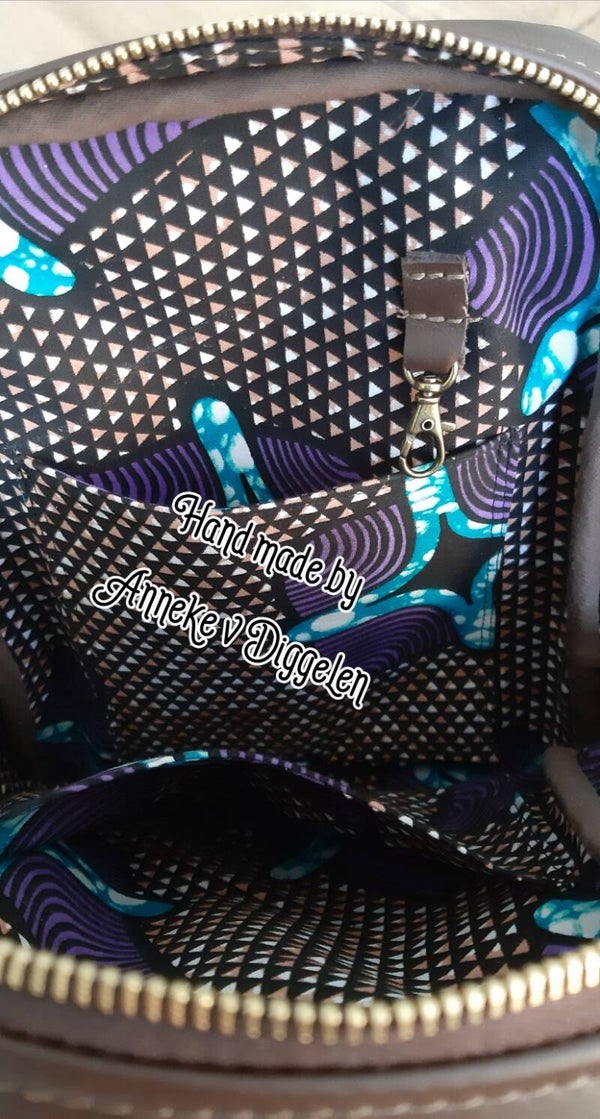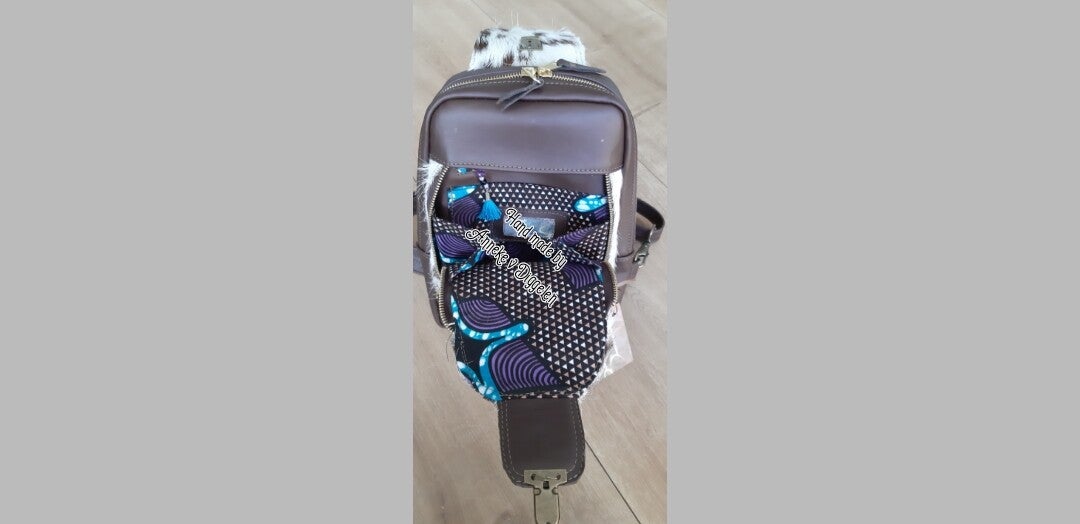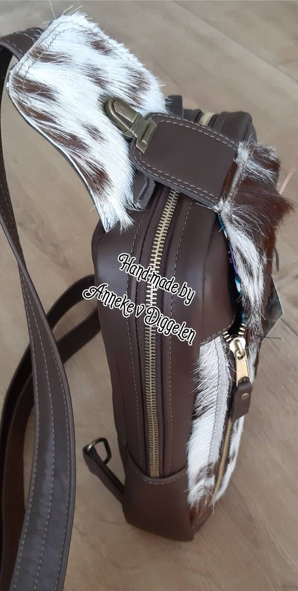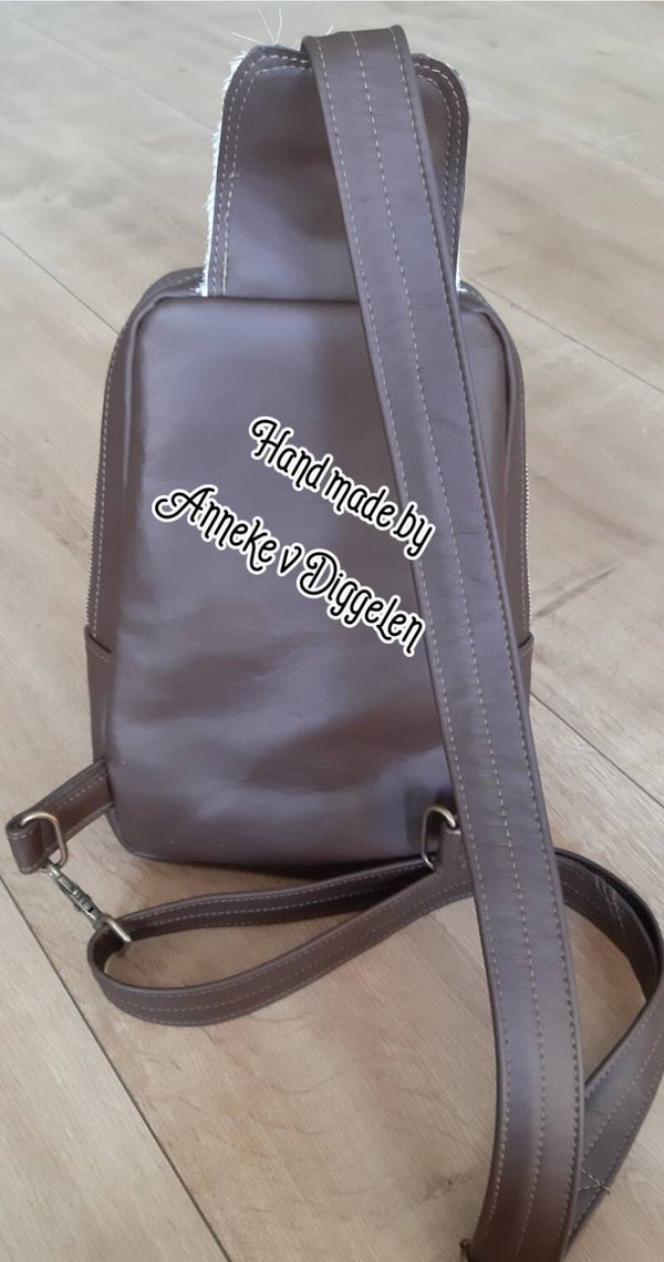 Deze rugtas heb ik gemaakt geheel van bruinleder in combinatie met geitenvacht.